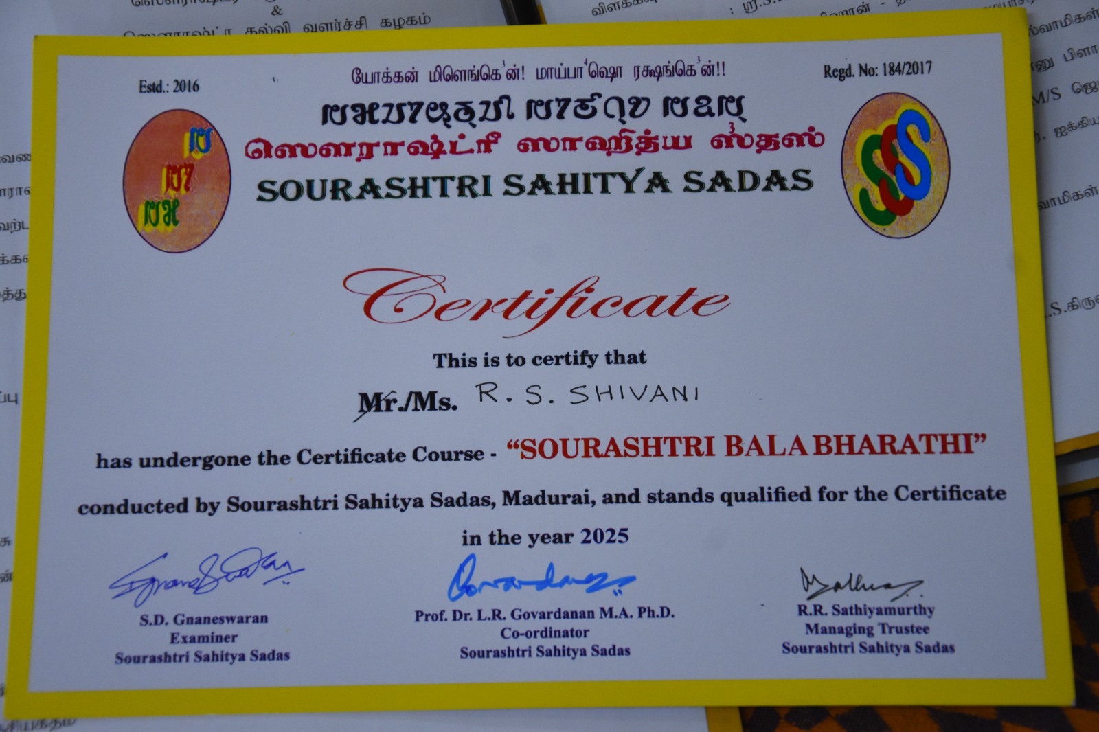 Saurashtri Yuva Bharathi certificate issuing function held in 2019 to the qualified students at Johannesburg, South Africa.